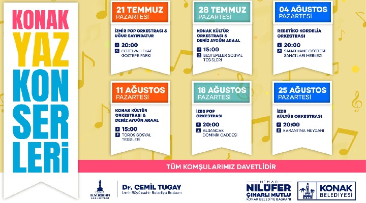 Konak Belediyesi, yaz akşamlarını müzikle dolduran Konak Yaz Konserleri’yle temmuz ve ağustos ayı boyunca her pazartesi, İzmirlilere müzik ziyafeti yaşatacak. İzmir Büyükşehir Belediyesi işbirliğiyle gerçekleştirilecek olan konserler, kentin dört bir yanında dinleyiciyle buluşacak. Güzelyalı Fuat Göztepe Parkı ile başlayacak konserler Beştepeler, Basmane, Toros, Alsancak ve Karantina’da devam edecek. Sıcakların bunalttığı yaz aylarında, aileleriyle birlikte çıkarak akşam esintisinden yararlanmak isteyen Konaklılara müzikli bir alternatif sunan konserlerde birbirinden değerli sanatçılar sahne alacak.