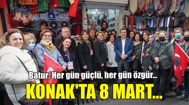 Konak Belediyesi’nin tüm haftaya yayılan, ilçenin dört bir yanındaki 8 Mart Dünya Emekçi Kadınlar Günü etkinliklerinde Başkan Batur da hayatın tüm alanlarında var olan Konaklı kadınların yanında yer aldı. Konak Belediyesi’nin Karataş’ta hizmete açtığı Kadın ve Sosyal Politikalar Merkezi açılışıyla başlayan Kadınlar Günü Haftası etkinlikleri, Güzelyalı Nazım Hikmet Kültür Merkezi’nde düzenlenen “Kadınlar ve Hikayeleri” adlı Kadın Sanatçı-Akademisyenler Karma Sergisiyle devam ederken Kadınlar Günü’nde de Konak Kadın Girişim Üretim İşletme Kooperatifi’nin satış mağazası açılışı gerçekleşti. Öte yandan Başkan Batur, Hatay Semt Merkezi’nde kursiyer kadınlarla Kadın Günü pastası kesti, Hatay Pazaryerinde de kadın esnafın ve alışveriş yapan kadınların gününü kutladı.