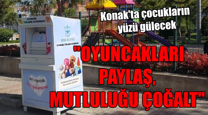 Konak Belediyesi, 23 Nisan Ulusal Egemenlik ve Çocuk Bayramı arifesinde Konaklı çocukların yüzlerini güldürecek bir kampanya başlattı. “Oyuncaklarınızı paylaşın, mutluluğu paylaşın” sloganıyla başlatılan kampanya kapsamında ilçenin 20 farklı bölgesine konulan oyuncak toplama kumbaralarında biriken oyuncaklar ihtiyaç sahibi ailelerin çocuklarına ulaştıracak. Özellikle parklara konuyan kumbaralarda biriken oyuncaklar, Konak Belediyesi Çevre Koruma Kontrol Müdürlüğü ekipleri tarafından toplanarak, Sosyal Yardım İşleri Müdürlüğüne teslim edilecek. Ekipler tarafından kategorize edilen oyuncaklar, ihtiyaç sahibi ailelerin çocuklarına dağıtılacak.