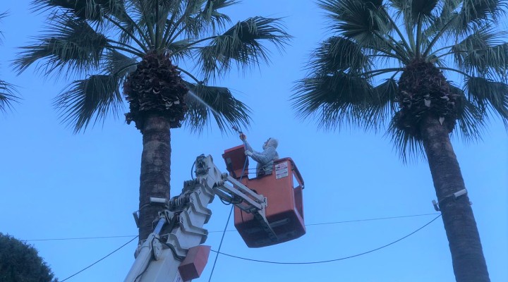 Konak Belediyesi Park ve Bahçeler Müdürlüğü ekipleri, palmiyelerin özellikle Phoenix türünde daha çok görülen “kırmızı böcek” ile yoğun mücadele ediyor. Palmiyelerin tepesinden giren kırmızı böceğin, ağacın gövdesine ilerleyerek larvalarını bırakması nedeniyle, böcekle daha etkin bir mücadele yöntemi olan enjeksiyonlu ilaçlama yapan ekipler, işlerini şansa bırakmıyor. Ağacın gövdesine takılan sonda ile ilaç enjekte edilerek, ağaç gövdesine bırakılan larvaların yaşamasına fırsat verilmiyor. Öte yandan kırmızı böceğin girdiği tespit edilen palmiyelere bom kullanılarak tepeden ilaçlama da yapılıyor. Belediye ekipleri, kırmızı böceğin girdiği tespit edilen palmiyeleri, son larvanın yok olduğu güne kadar on beş günde bir aynı yöntemle ilaçlıyor.