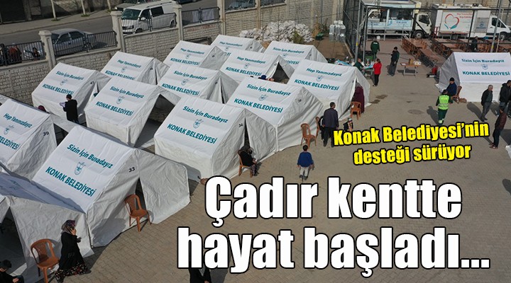 Depremin ilk gününden itibaren arama, kurtarma çalışmalarına katılarak, bölgeye acil yardım ve ihtiyaç malzemeleri gönderen Konak Belediyesi’nin Kahramanmaraş’ta kurduğu çadır kentte hayat başladı. Kahramanmaraş’ın Dulkadiroğlu ilçesinde bulunan Dulkadiroğlu İlkokulu’nun bahçesini yaşam alanına çeviren Konak Belediyesi, 100 çadırda yaklaşık 500 kişiye barınma imkânı sundu. Kurulur kurulmaz hızla dolan çadır kente yerleştirilen depremzede vatandaşlara, ihtiyaç duydukları hijyen ürünleri, yatak, yorgan ve giysiler de teslim edildi. Çadır kente ilk geldiklerinde kayıtları yapılan depremzede ailelerin özel durum ve gereksinimlerine göre ek önlemler alınırken, belediyenin uzman personeli de vatandaşlara psikolojik destek sunuyor.