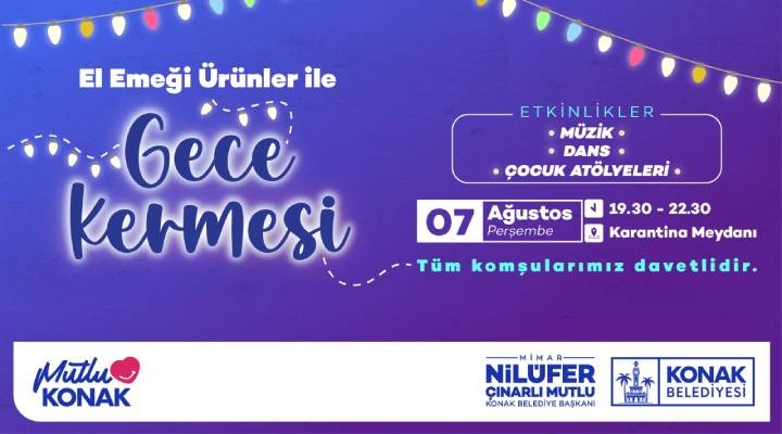 Konak Belediyesi’nin kentin hemen her noktasında, kadınların el emeği ürünlerini sergileme fırsatı sağlayan kermesleri bu kez Karantina Meydanı’nda kuruluyor. “Gece Kermesi” adı altında İzmirlilerle buluşacak olan kermeste, el emeği ürünlerin sergi ve satışının yapıldığı tezgahların yanı sıra müzik dinletileri, dans gösterileri ve çocuk atölyeleri de yer alacak. İlki 7 Ağustos Perşembe akşamı, 19.30-22.30 saatleri arasında yapılacak kermesler, ağustos ayı boyunca ve eylülün ilk haftasında devam edecek.
