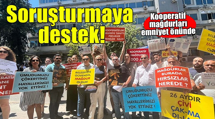 İzmir Büyükşehir Belediyesine yönelik yolsuzluk soruşturması kapsamında "ihaleye ve edimin ifasına fesat karıştırma" ve "nitelikli dolandırıcılık" suçlamasıyla eski İzmir Büyükşehir Belediye Başkanı Tunç Soyer ile CHP İzmir İl Başkanı Şenol Aslanoğlu'nun da aralarında bulunduğu 109 şüphelinin gözaltına alınmasının ardından, İzmir Kooperatif Mağdurları Birliği üyesi bir grup İzmir Emniyet Müdürlüğü Yeşilyurt hizmet binası önünde bir araya geldi.