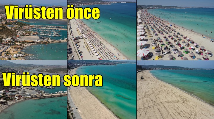 Deniz, kum ve güneşin keyfini çıkarmak için her yıl milyonlarca kişinin kullandığı plaj ve sahillerdeki, sakinlik ile "kontrollü normalleşme" süreci için alınan önlemler, Anadolu Ajansı ekipleri tarafından havadan görüntülendi. Fotoğrafta İzmir'deki Alaçatı plajı görülüyor.
