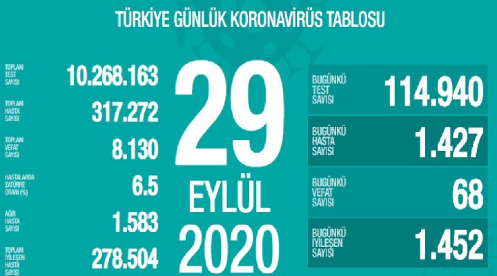 Türkiye’nin günlük koronavirüs tablosu açıklandı. 29 Eylül Salı gününün verilerine göre yapılan 114 bin 940 testle birlikte toplam test sayısı 10 milyon 268 bin 163’e ulaştı.