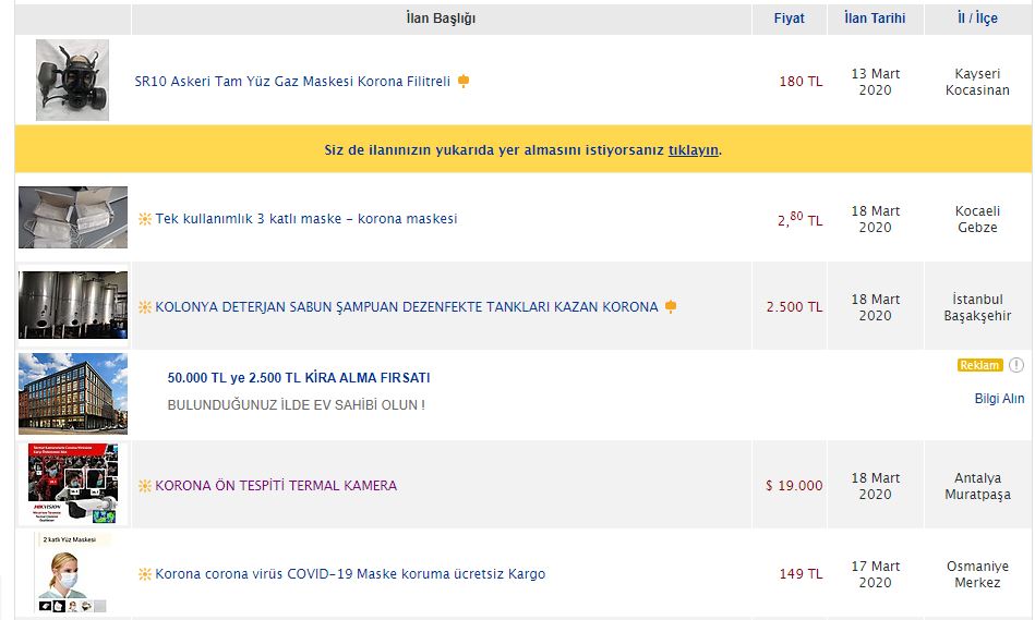 Diğer yandan, şuan büyük bir kriz yaşanan tıbbi maske ve eldiven konusunda da çok sayıda ilan verildi. Farklı farklı fiyatlarda, maske ve eldiven satışa sunuldu. "Korona ön tespiti" mesajıyla ateş ölçer termal kamera seti bile internet sitesinden satışa çıkarıldı.