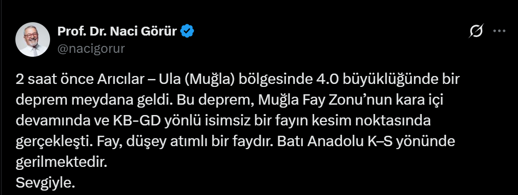 Yer bilimci Prof. Dr. Naci Görür, depremin Muğla Fay Zonunun kara içindeki devamında, isimsiz bir fayın kesişim noktasında meydana geldiğini, söz konusu fayın düşey atımlı olduğunu belirtti. Görür, bölgesel tektoniğe dikkat çekerek “Batı Anadolu geriliyor” değerlendirmesinde bulundu.