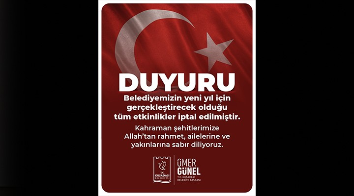 “Irak’ta 6, Pençe-Kilit Harekatı bölgesindeyse 6 askerimizin şehit olmasının ardından yaşanan acılara saygı gerekçesiyle, Kuşadası Belediyesi tarafından yeni yıl için 31 Aralık Pazar günü gerçekleştirilecek olan Haluk Levent konseri başta olmak üzere tüm kutlama etkinlikleri iptal edilmiştir. Kahraman şehitlerimize Allah’tan rahmet, ailelerine ve yakınlarına sabır diliyoruz”