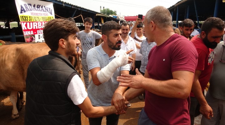 Olayı anlatan Özgür Kahraman, “3 gün süren bir pazarlığın sonucunda istediği paraya danayla beraber kolumu da aldı. Kolumda çatlak var. Alçıya alınacaktı ama bilerek aldırmadım. Hayvanları yüklemekte sıkıntı oluyor diye. Ankara’ya dönünce detaylı baktıracağım. Daha önce de benzer bir pazarlık yaşamıştım ama bu kadar değildi, orada incinmişti şimdi ise çatladı. Videoyu izledikten sonra pazarlık yaptığım kişi arayıp özür diledi. Ben de ona ‘Tedavi masraflarını hayvan parasının üzerine ekleyeceğim. Yine benim istediğim paraya gelecek’ dedim. O da ‘Canın sağ olsun’ dedi. Ben artık müşterilerden uzak durmaya çalışıyorum. Bu koldan sonra istediği fiyat neyse tamam abi diyorum ve çekiliyorum. Biz pazarlık yaparken sesleri duyan kavga ediyoruz sanıp bakmaya geldi. Kavga olmadığını görünce gülüp kameraya çekmeye başladılar. Pazarlıktan yarım saat sonra kolum ağrımaya başladı. Hastaneye gittim, çatlak var dediler. Kolum sarılı pazara gelince esnaf gülmeye başladı. Sosyal medyadan bu olayı görenler şaşırdı, eş dost herkes aradı” dedi.