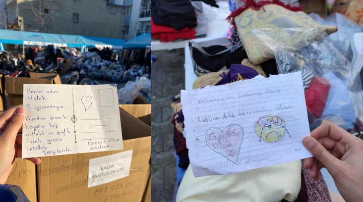 Toplama merkezine, Kuşadası’nda yaşayan çocuklar da aileleriyle birlikte gelerek deprem bölgesine ulaştırılması için oyuncaklarını ve giysilerini bağışlıyor. Yürekleri aynı ebeveynleri gibi afet bölgesi için atan miniklerin hazırladığı paketlerin üzerine iliştirdikleri notlarsa, okuyanlara duygu dolu anlar yaşatıyor. Yardım toplama merkezine babasıyla kışlık kıyafet getiren İlkokul öğrencisi Güney hazırladığı paketin üzerine yerleştirdiği nota, “Size üşümemeniz için kıyafetlerimi gönderdim. Sizi çok seviyorum” yazdı. Kağan isimli bir çocuk ise, oyuncak kaplanını koyduğu yardım paketine kalplerle süslediği “Yaşadıklarınız için ben de ailem de çok mutsuz olduk. İnşallah kurtulursunuz. Geçmiş olsun” yazılı kâğıdı iliştirdi. Melek ismindeki kız çocuğuysa notunda, “Üç yaşındayım. Bundan sonraki hayatın hep mutluluk ve sağlık içinde geçsin. Geçmiş olsun. Sevgilerimle” dedi.