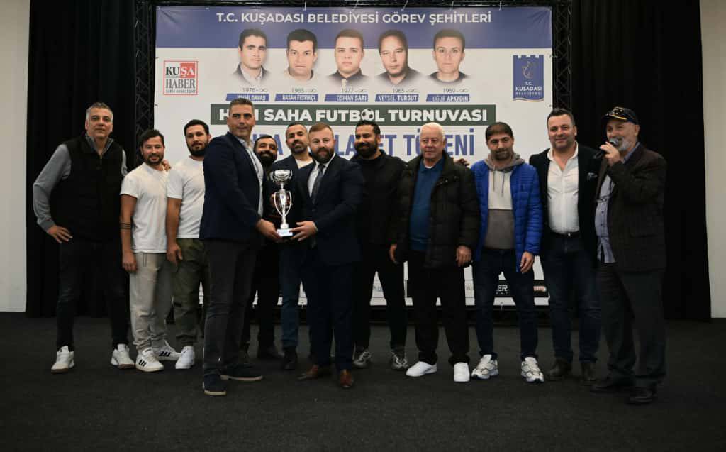 Kuşadası’nda kanalizasyon terfi istasyonunda 2015 yılında meydana gelen kazada, metan gazı zehirlenmesi sonucu görevleri başında hayatlarını kaybeden İsmail Davas, Hasan Fıstıkçı, Osman Sarı, Veysel Turgut ve Uğur Apaydın için ‘Kuşadası Belediyesi Görev Şehitleri Halı Saha Futbol Turnuvası’ düzenlendi. Kuşadası Belediyesi ve KUŞA Haber işbirliğinde gerçekleştirilen organizasyona 8 takım katıldı. Turnuvada dereceye giren takımlar ile organizasyona destek olan firmalara kupa ve plaketleri Pera Kültür, Düğün ve Organizasyon Merkezi’nde düzenlenen törenle Kuşadası Belediyesi Meclis üyeleri Mehmet Sarıdedeoğlu ve Tahsin Demirtaş tarafından verildi. Ödül töreni toplu fotoğraf çekiminin ardından sona erdi.
