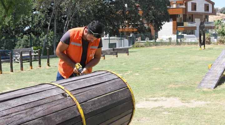 Kuşadası Belediyesi Park ve Bahçeler Müdürlüğü ekipleri, farklı mahallelerde yıl boyunca eş zamanlı olarak bakım onarım ve yenileme çalışmaları yürütüyor. Çocuk parklarındaki kent mobilyaları, oyun grupları ve yeşil alanların belirlenen program dâhilinde düzenli olarak bakımını yapan ekipler bir yandan da evcil hayvanlar için daha sağlıklı yaşam alanları oluşturmak amacıyla kente kazandırılan köpek eğitim parkını da unutmuyor. Bu kapsamda ekipler, Türkmen Mahallesi’nde 650 metrekare alan üzerine kurulu olan Pako Köpek Eğitim Parkı’nda bakım onarım çalışması gerçekleştirdi.
