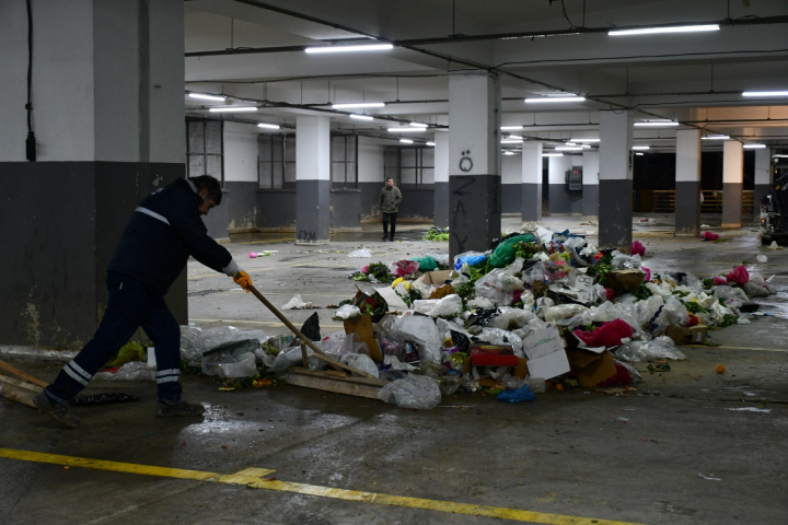 Bereketli bir gün geçirmenin verdiği mutlulukla pazarcı esnafının tezgahlarını toplamasının ardından Kapalı Pazar Yerinde bu kez Kuşadası Belediyesi Temizlik İşleri Müdürlüğü’nün yoğun mesaisi başlıyor. Özel bir ekiple Kapalı Pazar Yerine gelen Temizlik İşleri Müdürlüğü, ilk önce çevrede kalan sebze meyve ve diğer atıkları topluyor. Daha sonraysa her kat özenle süpürülüp, köpüklü sıcak suyla yıkanarak dezenfekte ediliyor. Gece geç saatlere kadar süren hummalı çalışmada Kapalı Pazar Yeri, Kuşadalıların sağlıklı ve hijyenik bir ortamda alışveriş yapabilmeleri için yeniden hazır hale getiriliyor.