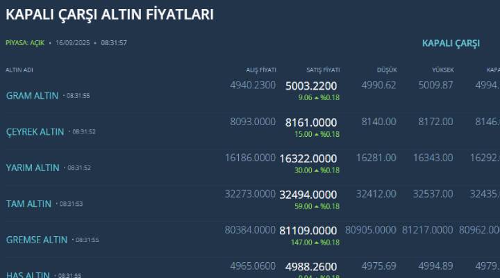 Kapalıçarşı altın fiyatları ile resmi altın fiyatları arasındaki fark devam ediyor. Resmi rakamlarda 4 bin 892 lira olan gram altın, Kapalıçarşı altın 5 bin lira oldu. İşte Kapalıçarşı altın fiyatları...