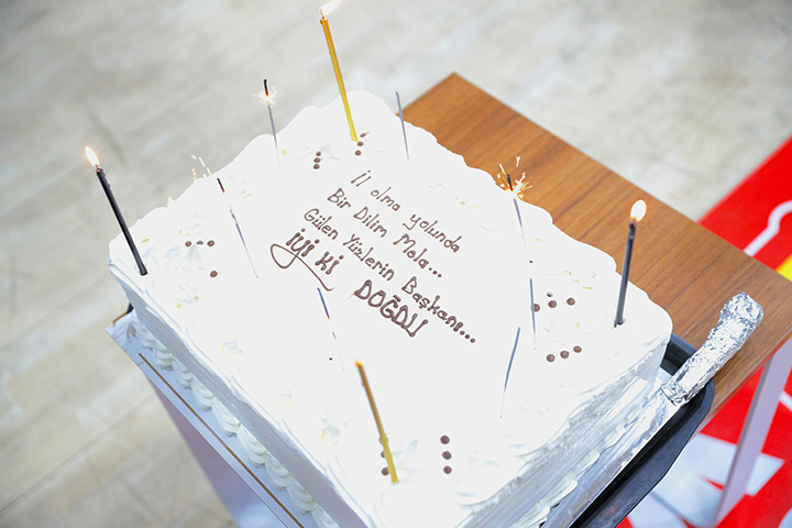Salona merhum sanatçı Müslüm Gürses’in “Seni Yazdım” şarkısı eşliğinde giren ve “İl olma yolunda bir dilim mola. Gülen yüzlerin başkanı iyi ki doğdu” mesajını içeren pastayı üfleyen Serkan Acar, "Yeni yılın sizlere ve ailelerinize sağlık ve huzur getirmesini diliyorum. Ülke genelinde yaşanan sıkıntıları Aliağa’da da hissettik ancak belediyemiz ve çalışanlarımız, vatandaşlarımıza bu zorlukları hissettirmeden hizmetlerini aksatmadan sürdürdü. Birçok yerde yaşanan olumsuzluklar Aliağa’da yaşanmadı. Hep birlikte mücadele verdik, yılmadık ve bir yılı daha tamamladık. Aliağamız, Türkiye’nin birçok noktasında özellikle kalkınması, değişimi, hizmetleri, sosyal aktiviteleri ve sosyal yardımları konusunda örnek gösteriliyor. Pek çok yer Aliağamızı rol model alıyor. Bu başarı sizlerin başarısıdır. Her fırsatta dile getiriyorum; en büyük destekçim, başımı hiçbir zaman eğmeyen siz değerli ekip arkadaşlarımsınız. Hepinize yürekten teşekkür ediyorum” dedi.