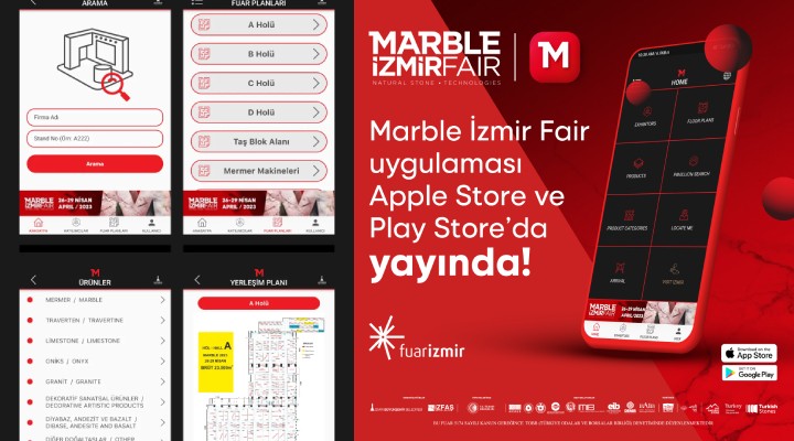 İzmir Büyükşehir Belediyesi ev sahipliğinde, İZFAŞ tarafından düzenlenen Marble İzmir Uluslararası Doğaltaş ve Teknolojileri Fuarı, sektöre katkı sağlamaya, Türk doğal taşının dünyaya açılan kapısı olmaya devam ediyor. Dünyanın dört bir yanından katılımcısı, yerli ve yabancı ziyaretçi sayısıyla öncü olan Marble İzmir, bu yıl yayına alınan mobil uygulaması ile de Türk doğal taşının daha geniş kitlelere ulaşmasına katkıda bulunacak. Hem Apple Store hem de Google Play’den cep telefonu ve tabletlere indirilebilen Marble İzmir Fair uygulaması ile dünyanın her yerinden Marble İzmir’i duyan, ürünlerden haberdar olmak ve fuara gelmek isteyen herkes bilgilendirilecek. Uygulama, fuar alanındaki katılımcı ve ziyaretçilere kolaylık sağlayacak.