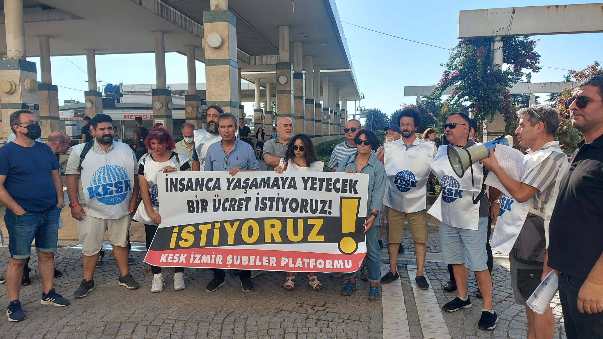 KESK üyeleri, akşam saatlerinde Konak'ta bir araya geldi. “İnsanca Yaşamaya Yetecek Bir Ücret İstiyoruz” yazılı pankart açan kamu emekçileri, sık sık “Zam, zulüm, işkence işte AKP”, “Gün gelecek devran dönecek, AKP halka hesap verecek” ve “AKP zammını al başına çal” sloganları attı. Yüksek enflasyona karşı ek zam talebinde bulunan kamu emekçileri adına basın açıklamasını KESK Şubeler Platformu Dönem Sözcüsü Bülent Karakaş okudu.