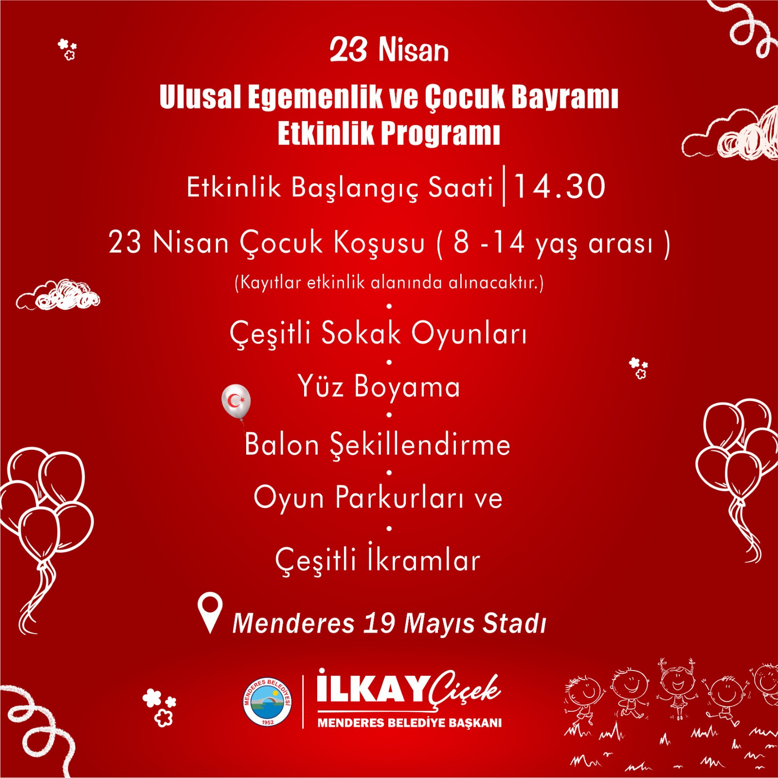 23 Nisan’da bayram coşkusunu çocuklara en iyi şekilde yaşatacaklarını ifade eden Menderes Belediye Başkanı İlkay Çiçek, “Ata'mızın tüm dünya çocuklarına armağanı olan bu özel günde biz de çocuklarımız için özel bir program hazırladık. 23 Nisan'da tüm çocuklarımız ve aileleri başta olmak üzere içinde ki çocuk ruhunu kaybetmeyen tüm vatandaşlarımızı Menderes'imize bekliyoruz" dedi.
