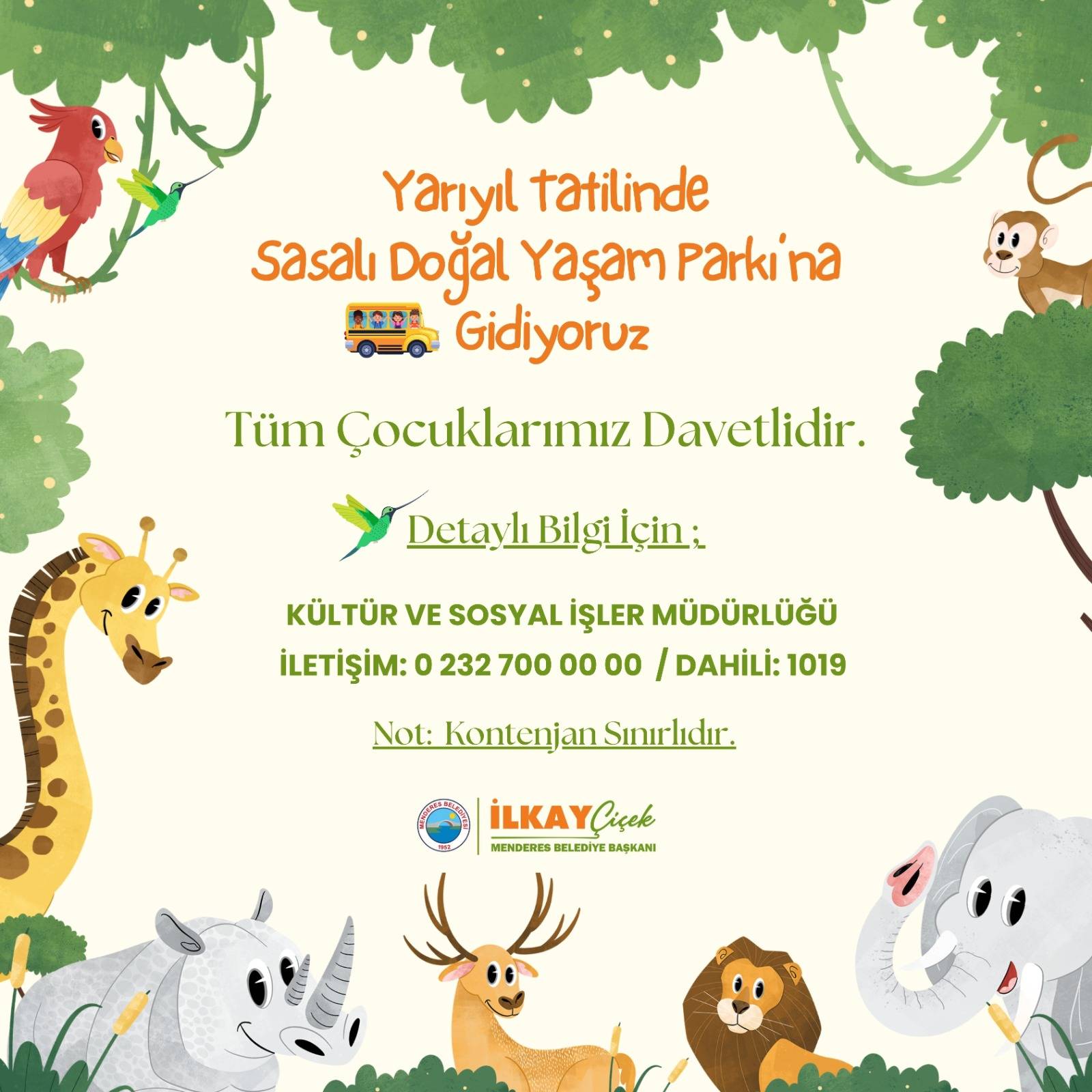 Menderes Belediyesi Kültür Sanat ve Sosyal İşler Müdürlüğü, çocukları yarıyıl tatilinde Sasalı Doğal Yaşam Parkı’na götürecek. Tüm çocuklara açık olan gezi yarıyıl tatilinde birçok defa düzenlenecek. Yoğun ilginin beklendiği Doğal Yaşam Parkı gezisi 19-30 Ocak tarihleri arasında toplam 8 defa yapılacak. Kontenjan ile sınırlı olan gezide başvurular Menderes Belediyesi Kültür Sanat ve Sosyal İşler Müdürlüğü’ne şahsen gelerek veya 0232 700 00 00 (dahili: 1019) numarasını arayarak yapılabilecek. Tüm tarihler için otobüs hareket saati 09:00 olacak.
