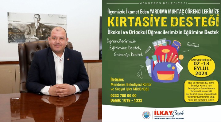 Eğitime yönelik desteklerin süreceğini kaydeden Menderes Belediye Başkanı İlkay Çiçek, ‘’Tüm gayemiz çocuklarımızın eşit şartlar altında eğitim almasını sağlamak. Elimizde ki imkanları da bu amaç doğrultusunda en iyi şekilde kullanıyoruz. Bu kapsamda başlattığımız kırtasiye desteğinden ihtiyaç sahibi ilkokul ve ortaokul öğrencilerimiz belediyemize başvuru yaparak faydalanabilirler. Geleceğimizin teminatı öğrencilerimizin eğitimine katkı sağlamak amacıyla başlattığımız desteklerimize devam edeceğiz. ‘’ dedi.