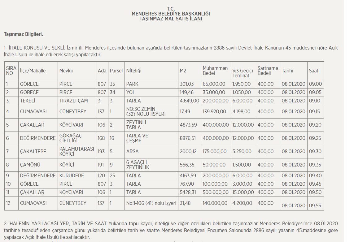 Satışa çıkan yerler arasında "park" ve "yol" vasfındaki iki taşınmaz ise dikkatleri çekti. Menderes Belediyesi, Görece Mahallesi Pirce Mevkii'ndeki 301,02 metrekarelik "park" alanı için 65 bin TL, yine aynı parselde yer alan 149,46 metrekarelik "yol" için ise 35 bin TL satış rakamı belirledi. İşte o ilan: