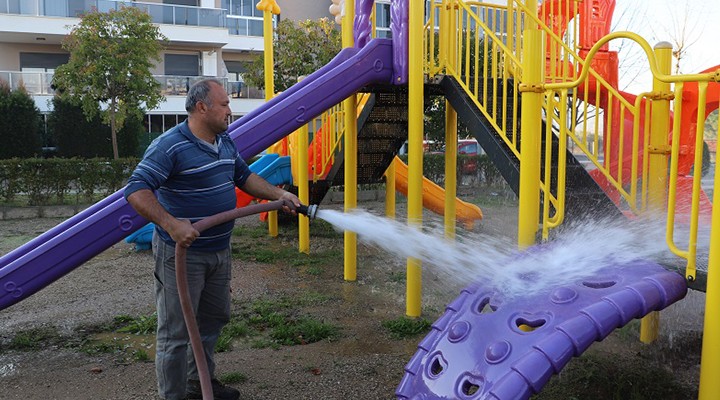 Menderes Belediyesi Park Bahçeler Müdürlüğü, özellikle son dönemde çocuklarda artan salgın hastalıklara önlem almak adına parkları dezenfekte etti. Parklarda yer alan tüm oyun ve spor grupları ile oturma alanları önce suyla yıkandı ardından da dezenfeksiyon işlemi uygulandı.