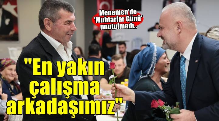 Muhtarlar Günü için kutlamaların ikinci adresiyse Menemen Belediyesi Tepe Sosyal Tesisleri oldu. Menemen Belediye Başkanı Aydın Pehlivan ve Menemen Kaymakamı Vedat Yılmaz muhtarlar ve aileleriyle akşam yemeğinde bir araya geldi. Menemen Muhtarlar Derneği Başkanı Nevzat Güven, "Belediye Başkanımız Sayın Aydın Pehlivan'a her zaman bizlerle olduğu için, hizmetleri için teşekkür ediyorum. Biz de kendisiyle çalışmaktan onur, gurur ve mutluluk duyuyoruz." dedi.
