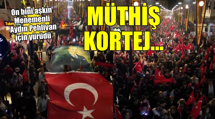 SONKALEİZMİR-Menemen'de düzenlenen Aydın Pehlivan'a destek korteji büyük ilgi gördü. On bini aşkın vatandaş Menemen İlçe Stadı'ndan Cumhuriyet Meydanı'na kadar uzayan insan seli oluşturdu.