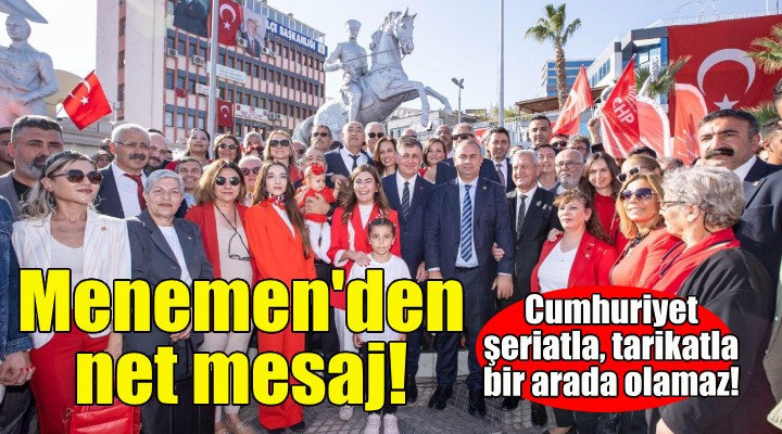 CHP Menemen İlçe Başkanı Hüseyin Özbey ise, “Cumhuriyet kimsesizlerin kimsesi olmak için kurulmuştur. Bize düşen en büyük görev Türkiye Cumhuriyetini ilelebet muhafaza ve müdafaa etmektir. Yaşadığımız bu zor günlerde Cumhuriyetin değerlerine sımsıkı sarılacağız ve yücelteceğiz. Cumhuriyete düşman olanlara asla geçit vermeyeceğiz” şeklinde konuştu.