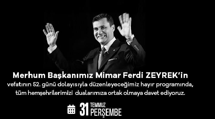 Manisa Büyükşehir Belediye Başkanı Besim Dutlulu, tüm Manisalıları anma programına davet ederek şunları söyledi: “Görevini her daim, çok sevdiği Manisa ve halkına olan sevgisiyle yerine getiren merhum Manisa Büyükşehir Belediye Başkanımız Ferdi Zeyrek’in vefatının 52. gününde, onu dualarla ve sevgiyle anıyoruz. 31 Temmuz Perşembe günü, Cumhuriyet Meydanı'nda düzenleyeceğimiz hayır yemeği ardından Hatuniye Camisi'nde mevlit programı ile merhum Başkanımızı dualarla yâd edeceğiz. Tüm hemşehrilerimizi Ferdi Başkanımız için birlikte dua etmeye davet ediyorum.”