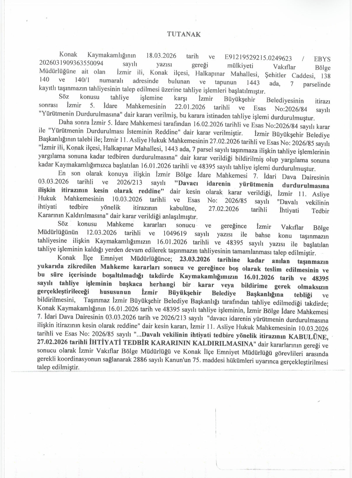 İzmir Büyükşehir Belediye Başkanı Cemil Tugay, Vakfılar Genel Müdürlüğü'nün kendi üzerine geçirmek istediği Meslek Fabrikası için tahliye emri geldiğini duyurdu. Binanın İzmir Büyükşehir Belediyesi'ne ait olduğuna dair belgeleri paylaşan Başkan Tugay, “Yapmayın, etmeyin, bu haksızlığa evet diyemeyiz. Hukuki süreç tamamlanana kadar tahliye istenmemelidir. İlgili kişi ve kurumların acilen bu yanlıştan dönmesini bekliyoruz” dedi.