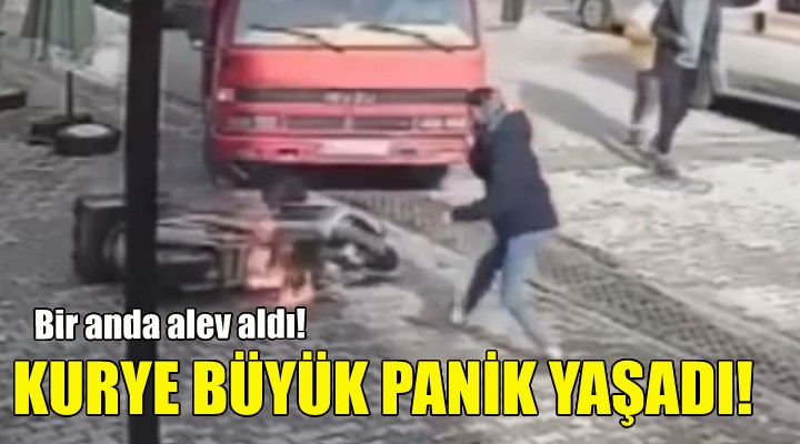 Kuryenin yaşadığı panik ve motosikletin yanmaya başladığı anlara dair görüntüler izmirdeçevirme sosyal medya hesabından paylaşıldı.