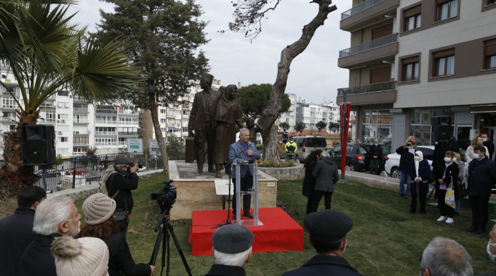 Eşrefpaşa Giritliler Derneği’nden Giritliler Federasyonu adına konuşan Konak Belediye Meclis Üyesi Ali Peynirci de duygusal anlar yaşadığı konuşmasında mübadelenin her iki tarafa da acılar, ızdıraplar yaşattığını belirterek, “Gidenler için de gelenler için de dil, uyum, barınma sorunu oldu ama Büyük Atatürk o dönemde gelen mübadillere sahip çıkmıştır. O acıları yaşayarak bu günlere geldik. Anıtın açılışına ben babamla geldim. Babam anıta bakıp, ‘Şu gördüğünüz anıtta elinde tahta bavulla gelenler tasvir edilmiş. Dedem de Girit’ten Ayvalık’a böyle tahta bir bavulla gelmiş’ dedi. O nedenle heykeltıraşa da o günleri çok güzel anlattığı için, derneğimizin, camiamızın isteğini kırmadığı ve böyle bir anıtı yaptırdığı için teşekkür ederiz” dedi.
