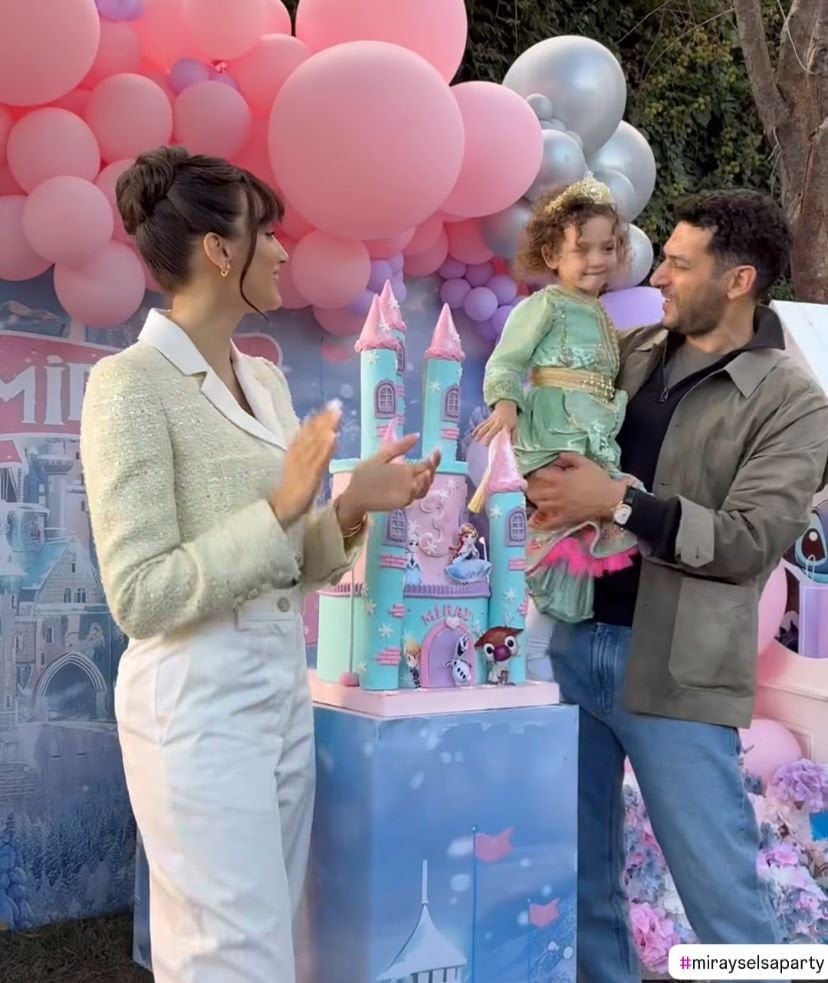 Ünlü çift kızları Miray için evlerinin bahçesinde doğum günü partisi düzenledi.