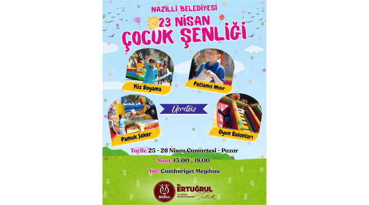 Kutlamalar, 25 ve 26 Nisan tarihlerinde Cumhuriyet Meydanı’nda kurulacak şişme oyun parkı ile devam edecek. Etkinlik alanında çocuklara patlamış mısır ve pamuk şeker ikramı da yapılacak.
