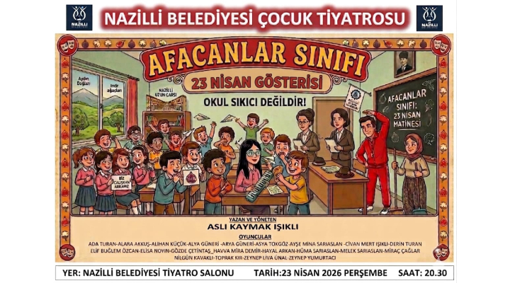 23 Nisan Perşembe günü saat 20.30’da yine aynı merkezde Nazilli Belediyesi Çocuk Tiyatrosu tarafından hazırlanan “Afacanlar Sınıfı” adlı tiyatro oyunu sahnelenecek.