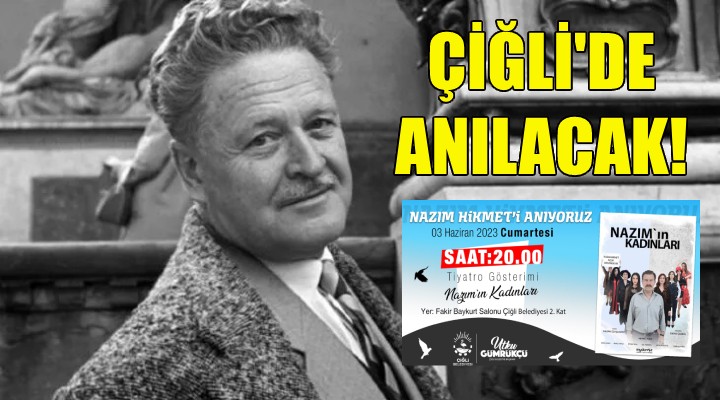 Çiğli Belediyesi Kültür ve Sosyal İşler Müdürlüğü’nün organize edeceği Nazım Hikmet’i anma etkinliği 3 Haziran Cumartesi günü saat 20:00’de Fakir Baykurt Salonu’nda gerçekleştirilecek. Etkinlikte, yönetmenliğini Erkan Çelikol’un yaptığı, oyuncu kadrosunu Mehmet Tokat, Öykü Gemici, Burcu Topçu, Zeynep Bone, Gül Türkmen, Mecbure Bozyel ve Tünay Alp Fırat’ın oluşturduğu tek perdelik “Nazım’ın Kadınları” isimli tiyatro gösterimi sahnelenecek. Gösterim ücretsiz olacak.