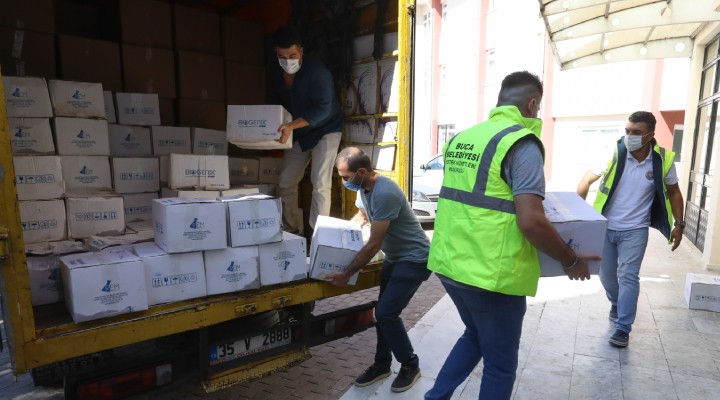 Yürütülen çalışma kapsamında yaklaşık 100 tonluk temizlik malzemesi, Buca’daki okullara dağıtılmak üzere İlçe Milli Eğitim Müdürlüğü’ne teslim edildi. Malzemeler içerisinde 300 bin adet maske, 5 bin litre el dezenfektanı, 50 bin litre sıvı el sabunu, 25 bin litre çok amaçlı temizlik malzemesi, 15 bin litre çamaşır suyu ve 2 ton iç cephe boyası yer aldı.