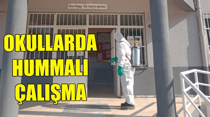 Temizlik İşleri Müdürlüğü, 7 personel ilk etapta, ilçe merkezinde bulunan 6 okulun bahçesinde bulunan otları temizleyerek, çevre düzenlemelerini gerçekleştirdi. Çalışmalara ilaçlama ile ilgili destek sunan İzmir Büyükşehir Belediyesi ekipleriyle yürütülen ortak çalışma kapsamında sınıflar, kapı kolları, öğretmen odaları, kütüphane, kantin, spor salonları, okul çevresi ve bahçesinde kullanılan çöp konteynerleri dezenfekte edildi.