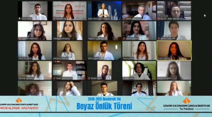 İEÜ Tıp Fakültesi'nde bu yıl eğitime başlayan 68 öğrenci için pandemi nedeniyle online eğitim düzenlendi. Üniversitenin sosyal medya hesaplarından canlı yayınlanan ve öğrencilerin eksiksiz yer aldığı törene; İEÜ Rektör Yardımcısı Prof. Dr. Çiğdem Kentmen Çin, İEÜ Medical Park Hastanesi Yönetim Kurulu Başkanı Op. Dr. Zafer Beken ve Tıp Fakültesi Dekanı Prof. Dr. Hakan Abacıoğlu da katıldı. Törende, Tıp Fakültesi Öğrenci Temsilcisi Seher Arı ve fakülteye bu yıl en yüksek puanla giren Onur Gülen de konuşma yaptı. Konuşmalarından ardından 6'sı yabancı toplam 68 öğrenci, beyaz önlüklerini giyerek hep birlikte 'Tıbbiyeli Yemini'ni okudu.
