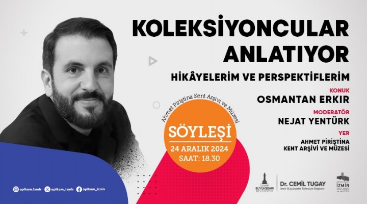 Ünlü yapımcı Osmantan Erkır, “Koleksiyoncular Anlatıyor” başlığıyla düzenlenen söyleşi dizisi kapsamında Ahmet Piriştina Kent Arşivi ve Müzesi’ne (APİKAM) konuk olacak. Televizyon programlarıyla tanınan Erkır, bu kez pek bilinmeyen bir yönüyle, koleksiyoncu kimliğiyle İzmirlilerle bir araya gelecek.