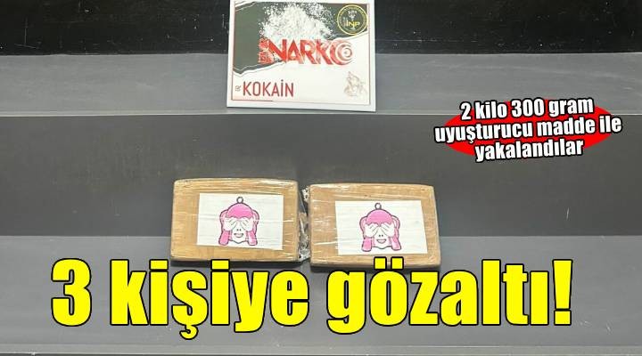 İzmir Cumhuriyet Başsavcılığı koordinesindeki Narkotik Suçlarla Mücadele Şube Müdürlüğü ekipleri tarafından uyuşturucu satıcılarına yönelik çalışma başlatıldı. Bu kapsamda Karabağlar ilçesinde, dün, bir otomobil şüphe üzerine durduruldu. Otomobilde narkotik köpeği 'Erez' ile yapılan aramada 2 kilo 300 gram kokain ele geçirildi. Otomobildeki şüpheliler M.Y., S.S. ve T.C. gözaltına alındı. Şüphelilerin polisteki işlemlerinin sürdüğü bildirildi.