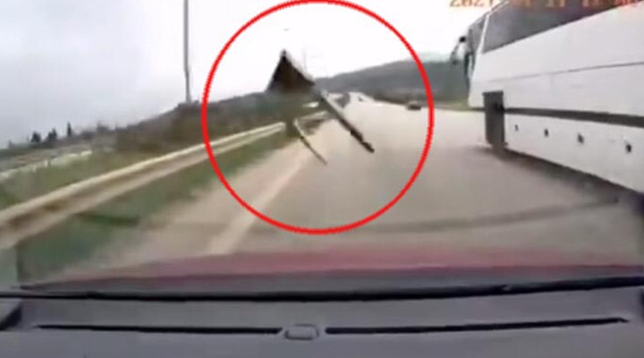 İzmir- Çeşme Çevre Yolu'nda kameralara yansıyan olay, geçen pazartesi günü yaşandı. Çeşme'den İzmir yönüne giden yolcu otobüsünün ön çamurluğundan kopan parça, sol şeritten hızla ilerleyen otomobilin önünden geçti. Otomobil sürücüsüne büyük korku yaşatan çamurluk, refüje çarpıp, yola düştü. Sürücü, olası kazadan şans eseri kurtulurken, çamurluğun kopma ve refüje çarpma anı, otomobildeki araç kamerasınca görüntülendi.