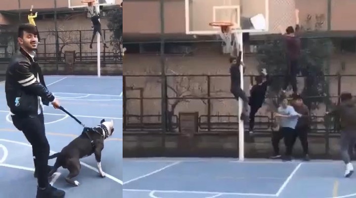 Pitbullu gören çocuklar saha içinde kaçışmaya başladı. Korku dolu anların yaşandığı olayda çocukların kimi tellere, kimisi de potaya tırmanmaya çalıştı. Bu sırada çocukların korkudan, “Şahin abi ne olur getirme” şeklinde bağırdıkları görüldü.