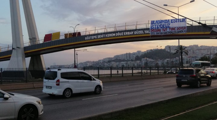 Özel kurum öğretmenleri, Güzelyalı sahilinde bulunan Göztepe Köprüsü’ne astıkları Özel Sektör Öğretmenleri Sendikası imzalı pankartla “Ulaşımda eşitlik istiyoruz. Sözünü Tut Tunç Soyer…” diyerek, Tunç Soyer’e seslendi. 14 Ağustos 2023 tarihinde Özel Sektör Öğretmenleri Sendikası temsilcileri, İzmir Büyükşehir Belediye Başkanı Tunç Soyer ile görüşmüş; Soyer, bu indirimi yapmayı istediklerini, kendilerine gereken yasal dayanakların sunulması ve zaten açık olan bu hakkın belgelemesi durumunda indirimli ulaşım kartı hakkına ilişkin sürecin olumlu ilerleyeceği sözünü vermişti.