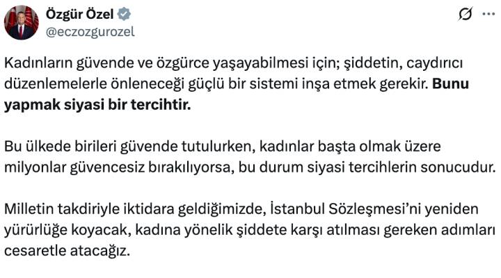 Sosyal medya hesabından açıklama yapan Özel, “Kadınların güvende ve özgürce yaşayabilmesi için; şiddetin caydırıcı düzenlemelerle önleneceği güçlü bir sistemi inşa etmek gerekir. Bunu yapmak siyasi bir tercihtir.” ifadelerini kullandı.