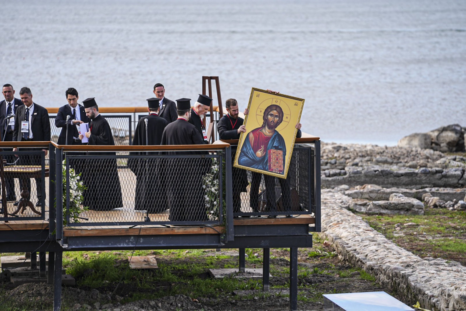 Bursa'nın İznik ilçesindeki Aziz Neophytos adına inşa edildiği belirlenen batık bazilika kalıntısında yapılacak ayin öncesi alanda son hazırlıklar yapıldı. Bazilika, İznik Gölü'nde su çekilmesiyle 2014 yılında ortaya çıkmıştı.
