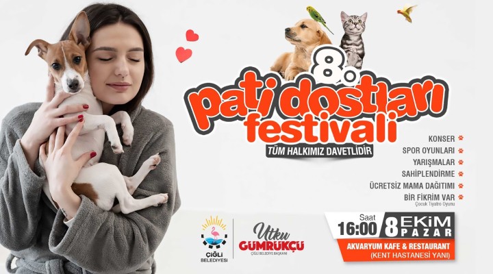 Çiğli Belediyesi Veteriner İşleri Müdürlüğü'nün organize edeceği 8. Pati Dostları Festivali, 8 Ekim Pazar günü saat 16:00'da Akvaryum Kafe Restoran'da gerçekleştirilecek. Festivalde konser, çocuk tiyatrosu gösterimi, yarışmalar ve spor oyunlarının yanı sıra sahiplendirme ve mama dağıtımı yapılacak.