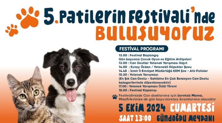 Gündoğdu Meydanı’nda gün boyu sürecek etkinlikler arasında Can Dostlar Yetenek Yarışması, Kutay Özkan’la Yetenekli Köpekler gösterisi, İzmir İl Emniyet Müdürlüğü Atlı Polis Birimi ve Köpek Eğitim Merkezi’nin (KEM) gösterisi ve yetenek yarışması yer alacak. Patilerin Festivali’nde çocuklar için de birbirinden eğlenceli oyun ve eğitim atölyeleri düzenlenecek.