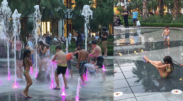 Gülçin SERBEZ/SONKALE-İzmir'de yaz mevsimi kendisini iyiden iyiye hissettirirken, sıcaktan bunalan çocuklar çareyi süs havuzları ile fıskiyelerde buldu. Karşıyaka Mavibahçe Alışveriş Merkezi'nin meydanında bulunan fıskıyelerden çıkan suyla serinleyen çocuklar, keyifli dakikalar geçirdi. Ailelerinin kenarda bekleyip izlediği çocuklar uzun süre sudan çıkmadı. Bazı ailelerin özellikle mayolarını giydirerek çocuklarını plaja gider gibi hazırladığı görüldü. Sudan çıkmak istemeyen, çevredeki müzikle adeta kendinden geçen çocuklar, renkli görüntüler oluşturdu. Alışveriş merkezine gelen vatandaşlar cep telefonlarıyla şen şakrak haldeki çocukların görüntülerini aldı.